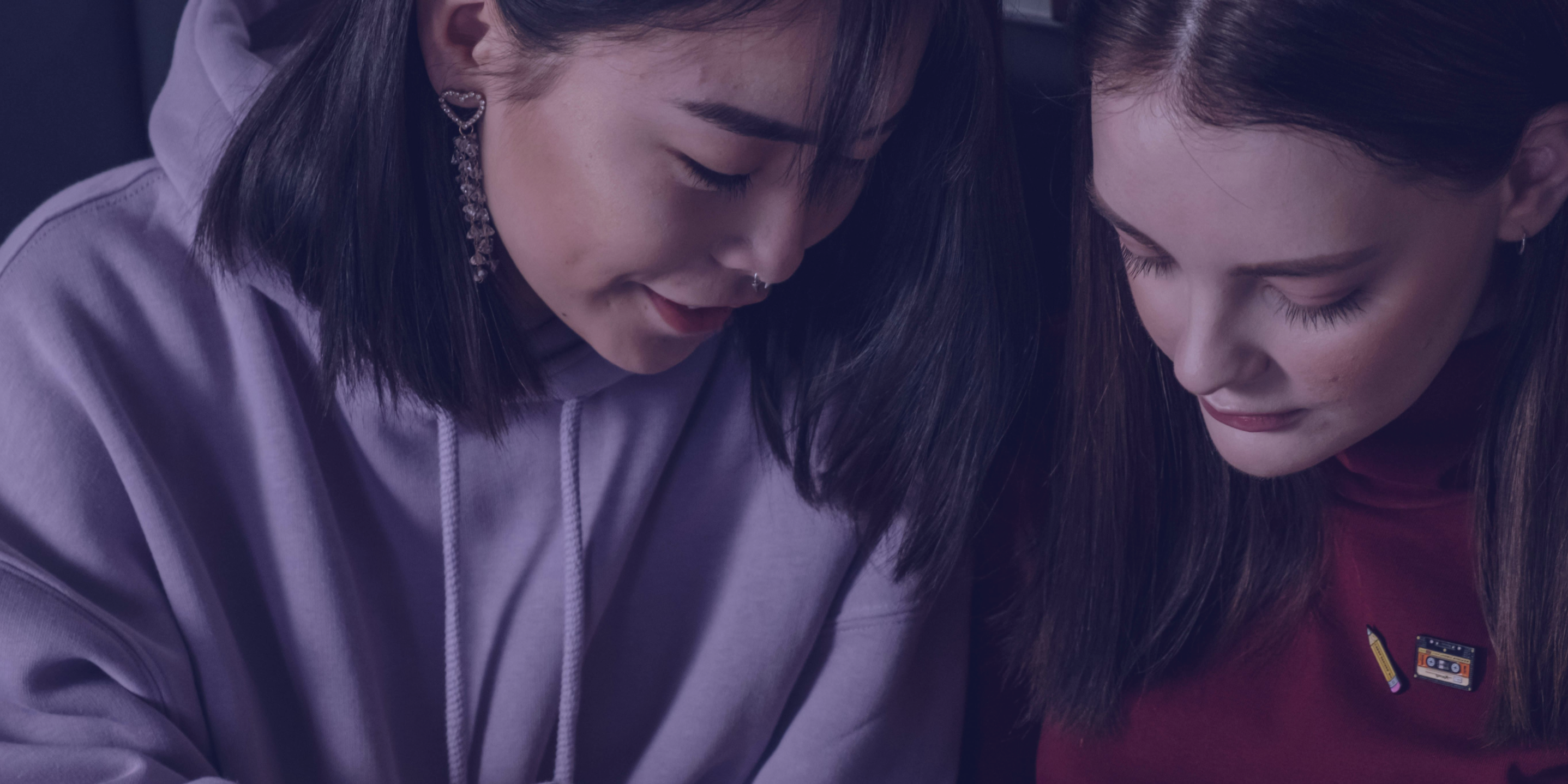 2. two girls are smiling and writing down notes and sharing a laptop